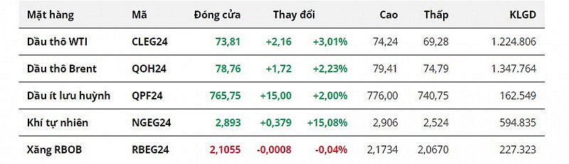 Cụ thể, giá dầu WTI tăng 3,01% lên mức 73,81 USD/thùng. Dầu Brent chốt phiên tại mức giá 78,76 USD/thùng, giảm 2,23% so với tuần trước đó.