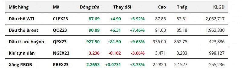 Cụ thể, giá dầu WTI kỳ hạn tháng 11 tăng gần 6% lên mức 87,69 USD/thùng. Dầu Brent tháng 12 chốt tuần với mức giá 90,89 USD/thùng, cao hơn 7,46% so với tuần trước đó.