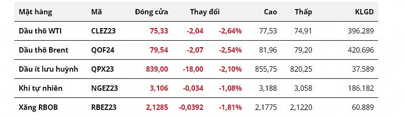 Kết thúc ngày giao dịch 8/11, giá dầu tiếp tục giảm hơn 2% xuống mức thấp nhất trong hơn 3 tháng do lo ngại nhu cầu suy yếu. Cụ thể, giá dầu WTI giảm 2,64% xuống 75,33 USD/thùng. Giá dầu Brent chốt phiên tại 79,54 USD/thùng, giảm 2,54% so với phiên trước. Như vậy, chỉ trong vòng 2 phiên, giá dầu đã đánh mất gần 6 USD/thùng.