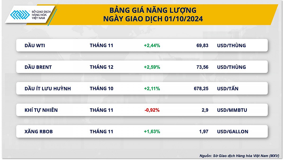 Thông tin từ Sở Giao dịch hàng hóa Việt Nam (MXV), kết thúc phiên giao dịch hôm qua (1/10), giá dầu thế giới đảo chiều tăng mạnh do lo ngại xung đột tại Trung Đông gia tăng sau khi có thông tin Iran bất ngờ thực hiện các cuộc không kích vào Israel nhằm đáp trả việc Tel Aviv tiến vào lãnh thổ Lebanon. Chốt phiên, giá dầu WTI tăng 2,44% lên mức 69,83 USD/thùng, dầu thô Brent tăng 2,59% lên mức 73,56 USD/thùng.