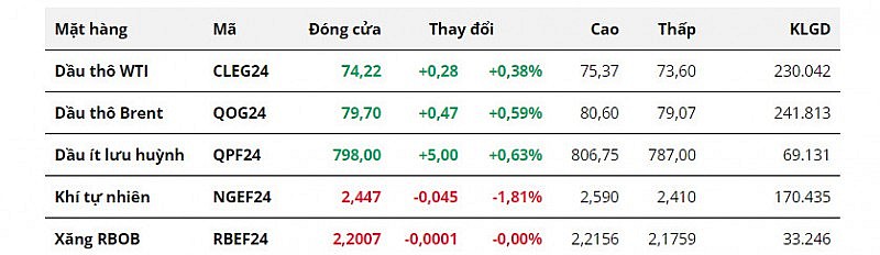 Chốt phiên, giá dầu WTI ghi nhận phiên tăng thứ ba liên tiếp với mức tăng 0,38% lên 74,22 USD/thùng. Dầu Brent tăng 0,59% lên 79,70 USD/thùng.