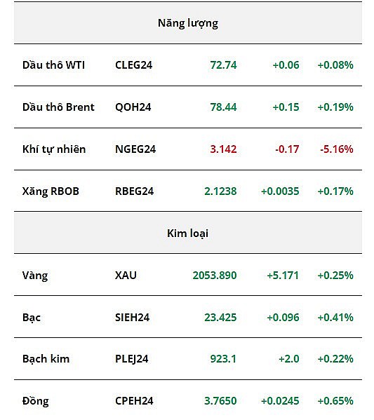 Giá dầu (CLEG24 +0,08%) tăng nhẹ trong phiên sáng khi các nhà giao dịch vẫn cảnh giác với nguy cơ gián đoạn nguồn cung ở Trung Đông sau các cuộc không kích của lực lượng Mỹ và Anh nhằm ngăn chặn nhóm phiến quân Houthi ở Yemen tấn công các tàu ở Biển Đỏ. Trong khi đó, vào Chủ nhật, lực lượng Houthi đã đe dọa sẽ “phản ứng mạnh mẽ” trước hành động của Mỹ, làm gia tăng thêm mối lo ngại về sự leo thang của một cuộc xung đột lan rộng khắp Trung Đông kể từ Hamas và Israel tham chiến.