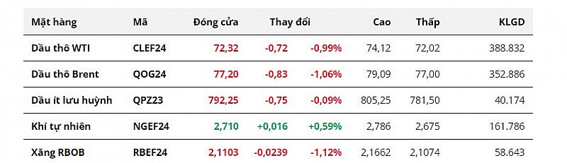 Kết thúc ngày giao dịch ngày 5/12, giá dầu bị đẩy xuống vùng thấp nhất trong vòng gần 5 tháng qua trước lo ngại về nhu cầu suy yếu, trong khi nguồn cung vẫn được đảm bảo. Dầu WTI giảm 0,99% xuống 72,32 USD/thùng. Dầu Brent đóng cửa với mức giá 77,2 USD/thùng, giảm 1,06%. Đây là mức đóng cửa thấp nhất đối với cả hai loại dầu thô kể từ ngày 6/7, cũng là lần đầu tiên kể từ tháng 5, giá dầu WTI ghi nhận 4 phiên giảm liên tiếp.