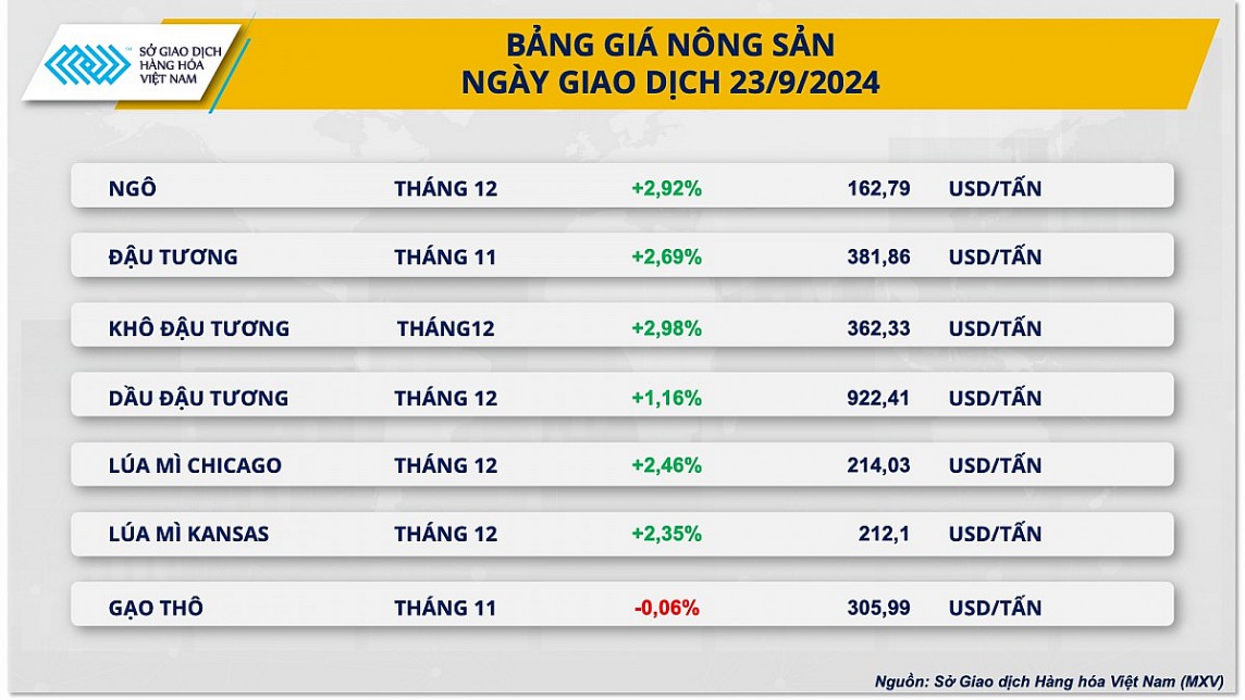 Sắc xanh cũng phủ kín bảng giá hai mặt hàng thành phẩm của đậu tương trong ngày hôm qua. Giá khô đậu tương hợp đồng tháng 12 dẫn đầu đà tăng của cả nhóm với mức tăng lên tới gần 3% đưa giá niêm yết của mặt hàng này lên mức 362,3 USD/tấn. Bên cạnh đó, giá dầu đậu tương hợp đồng tháng 12 cũng tăng hơn 1% lên mức 922,4 USD/tấn.