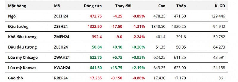 Trong khi đó, khô đậu tương là mặt hàng nông sản giảm mạnh nhất cả nhóm, khi lao dốc 2,24% trước áp lực bán chốt lời của thị trường.