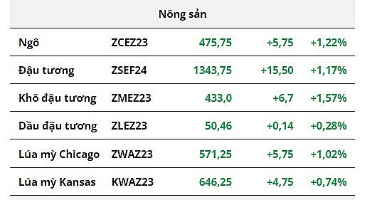 Sắc xanh phủ kín bảng giá nhóm nông sản sau khi mở cửa phiên tối. Giá đậu tương (ZSF2024 +1,17%) duy trì đà tăng từ đầu phiên trong bối cảnh nhu cầu quốc tế đối với đậu tương Mỹ tăng cao. Trong báo cáo Bán hàng Hàng ngày (Daily Export Sales) tối nay, USDA cho biết các nhà xuất khẩu Mỹ bán được đơn hàng 131.150 tấn đậu tương niên vụ 23/24 cho một nước giấu tên. Bên cạnh đó, giá ngô (ZCZ2023 +1,22%) và giá lúa mì (ZWZ2023 +1,02%) cũng tăng mạnh nhờ lực mua kỹ thuật của thị trường.