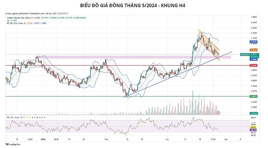 Về mặt kỹ thuật giá đồng, khung H4, giá đang di chuyển trong một kênh giảm giá nhỏ với việc thiết lập đỉnh sau thấp hơn đỉnh hơn đỉnh trước, đáy sau thấp hơn đáy trước. Tuy vậy, giá đang hướng tới vùng hỗ trợ là trendline tăng giá, đồng thời cũng là vùng hỗ trợ 3,96 – 3,98 USD, dự báo giá có thể hồi trở lại từ vùng này. Nhà đầu tư có thể chờ mua tại 3,98 USD, kỳ vọng chốt lời tại 4 – 4,02 USD. Nếu giá break khỏi vùng này, giá có thể hướng xuống mục tiêu 3,91 USD trong những phiên tới.