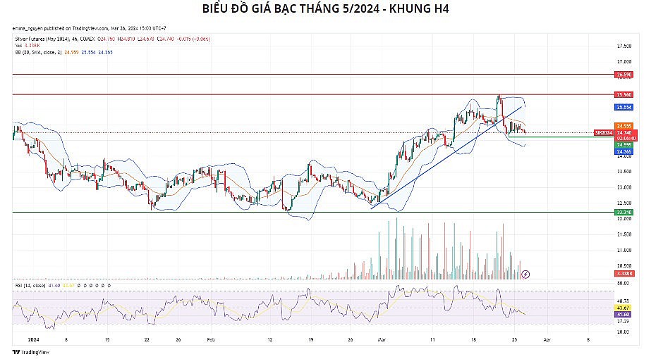 Về mặt kỹ thuật giá bạc, khung H4, giá đang giằng co tích lũy và chưa hình thành xu hướng mới sau khi giá rơi xuống trendline tăng giá. Sự hình thành của các nến giảm ngắn kết hợp với dải Bollinger Bands dần thu hẹp cho thấy lực bán yếu dần. Dự kiến giá có thể tiếp tục giảm về 24,5 USD trong phiên hôm nay.