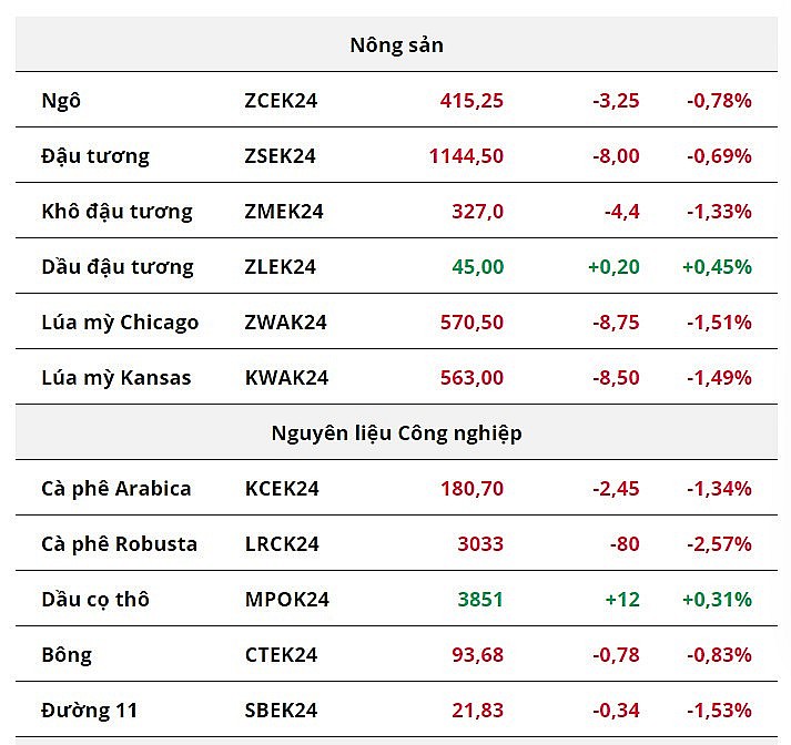 Phe bán tạm thời chiếm ưu thế trên bảng giá nông sản vào đầu phiên giao dịch tối nay. Giá lúa mì (ZWAK24 -1,51%) đang ghi nhận mức sụt giảm mạnh nhất trong nhóm ngũ cốc, do phản ứng với tình hình xuất khẩu kém khả quan của Mỹ. Cụ thể, Bộ nông nghiệp Mỹ (USDA) ghi nhận doanh số bán lúa mì đạt 233.521 tấn, giảm 33,1% so với tuần trước đó và nằm dưới khoảng dự đoán của thị trường. Điều này cho thấy nhu cầu quốc tế đối với lúa mì Mỹ vẫn ở mức thấp trước áp lực nguồn cung giá rẻ từ Biển Đen.