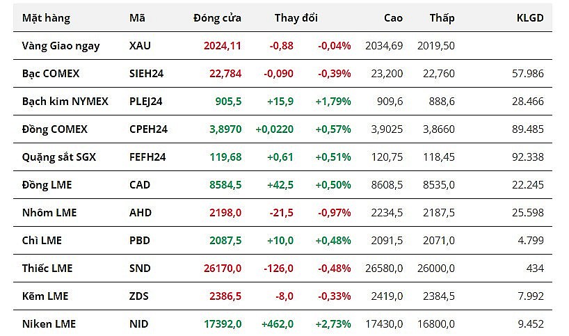 Kết thúc phiên giao dịch ngày 22/2, bảng giá kim loại tiếp tục cho thấy những diễn biến phân hoá. Đối với nhóm kim loại quý, trong khi giá bạc giảm 0,39% xuống 22,78 USD/ounce thì bạch kim tăng 1,79% lên 905,5 USD/ounce. Bạc vẫn là kim loại chịu sức ép mạnh mẽ nhất bởi kỳ vọng Cục Dự trữ Liên bang Mỹ (FED) sẽ không sớm hạ lãi suất như thị trường mong đợi, nhất là sau hàng loạt dữ liệu kinh tế tích cực công bố vào tối qua.