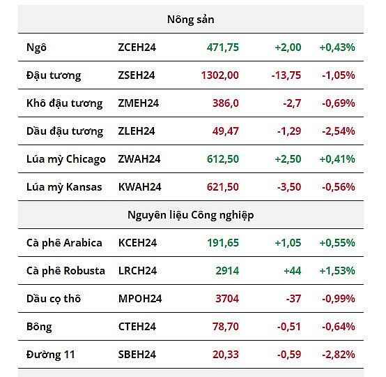 Giá lúa mì (ZWAH24 +0,41%) vẫn đang giữ được sắc xanh, do được thúc đẩy bởi triển vọng nguồn cung kém khả quan của EU. Công ty tư vấn Strategie Grains đã dự báo sản lượng lúa mì mềm của Liên minh châu u sẽ đạt 124,8 triệu tấn trong năm 2024, giảm 1% so với mức 125,9 triệu tấn năm nay, do thời tiết ẩm ướt làm trì hoãn việc gieo trồng ngũ cốc tại Pháp. Strategie Grains cũng hạ dự báo tổng diện tích lúa mì mềm của EU xuống còn 21,2 triệu héc-ta, giảm 2,4% so với niên vụ 2023/24.