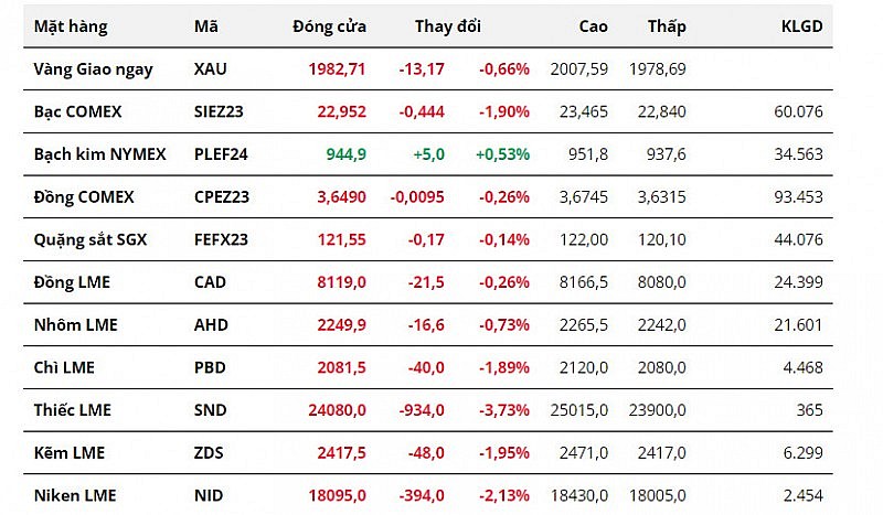 Kết thúc ngày giao dịch cuối cùng của tháng 10, sắc đỏ áp đảo bảng giá nhóm kim loại do tác động tiêu cực của cả yếu tố vĩ mô và cung – cầu. Đối với nhóm kim loại quý, bạch kim là mặt hàng tăng giá duy nhất trong nhóm, chốt phiên tại mức 944,9 USD/ounce sau khi tăng 0,53%. Trái lại, giá vàng và bạc đồng loạt suy yếu. Cụ thể, giá bạc giảm về mức 22,95 USD/ounce sau khi giảm 1,9% và giá vàng suy yếu 0,66%, dừng chân ở mức 1.982,71 USD/ounce.