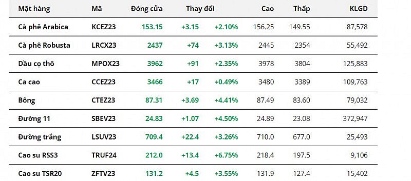 Giá hai mặt hàng cà phê cũng ghi nhận sự khởi sắc với mức tăng lần lượt 2,10% của Arabica và 3,13% của Robusta. Bất chấp việc nguồn cung cà phê đang sẵn có tại Brazil, tồn kho cà phê ở mức thấp đối với cả hai mặt hàng đã tạo những hỗ trợ lên giá.