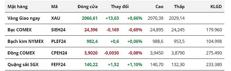 Đối với kim loại quý, giá bạch kim tăng nhẹ 0,06% lên 982,4 USD/ounce, tiếp tục neo ở mức cao nhất kể từ cuối tháng 8/2023. Trái lại, giá bạc suy yếu 0,69% về 24,39 USD/ounce. Tuy nhiên, cả hai mặt hàng này đều có xu hướng giằng co đi ngang trong phiên do khối lượng giao dịch mỏng.