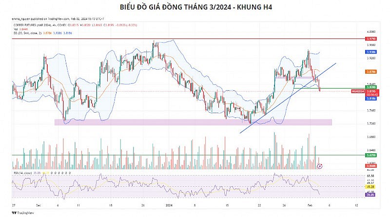 Về mặt kĩ thuật giá đồng, khung H4, sau loạt nến spining top hình thành, giá đang giảm mạnh và có dấu hiệu break khỏi đáy trước là 3,82 USD cho thấy lực bán áp đảo. Trendline tăng ngắn hạn cũng bị phá vỡ, dự kiến giá sẽ tiếp tục giảm trong phiên hôm nay. Tuy vậy, RSI khung H1 đang ở vùng quá bán, lực bán có thể yếu dần. Dự kiến giá có thể điều chỉnh giảm nhẹ về 3,80 USD.
