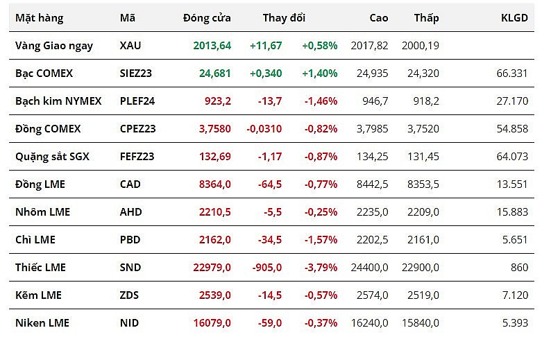 Đối với kim loại quý, giá bạc tăng 1,4% lên 24,68 USD/ounce, đánh dấu phiên tăng thứ ba liên tiếp. Giá vàng vẫn duy trì trên mốc 2.000 USD/ounce, kết phiên tăng 0,58% lên 2.013,64 USD/ounce. Trái lại, giá bạch kim giảm 1,46% về 923,2 USD/ounce.