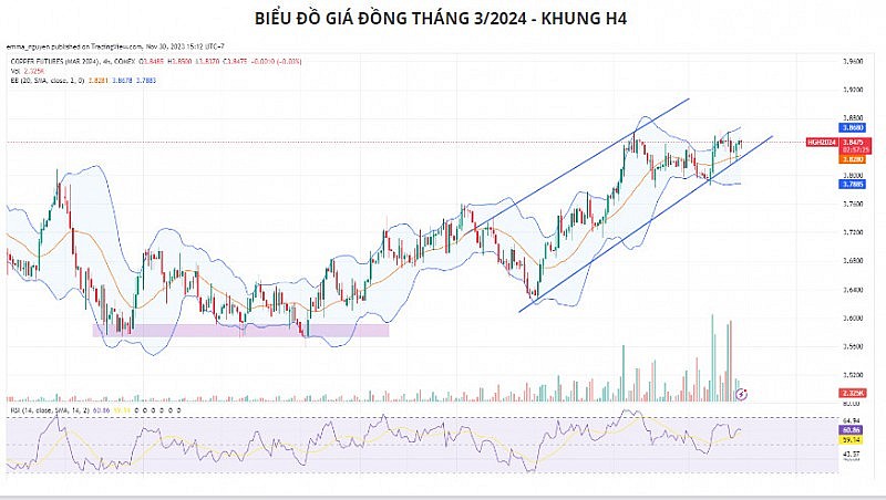 Về mặt kĩ thuật giá đồng, khung H4, giá vẫn đảm bảo di chuyển trong kênh xu hướng tăng ngắn hạn. Đồng thời giá đang di chuyển ở nửa trên của dải Bollinger Bands với hỗ trợ là đường SMA. Với thông tin cơ bản thiên hướng “bullish”, dự báo giá có thể tăng hướng tới kháng cự là cạnh trên của dải BB, ở mức 3,86 USD.
