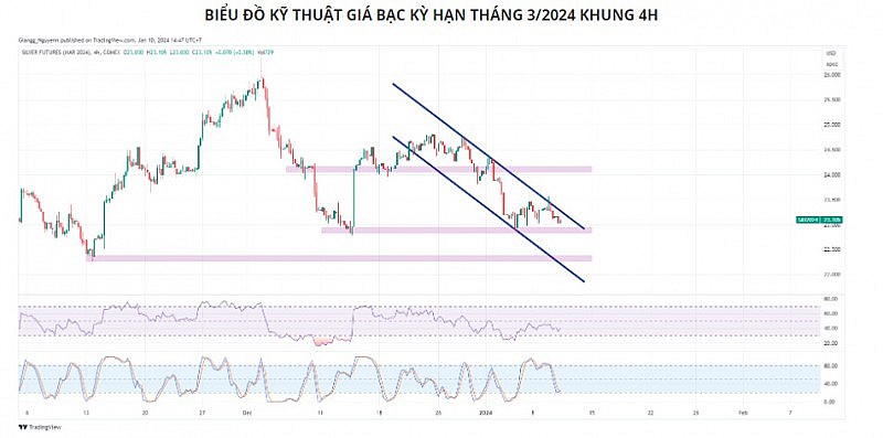 Về mặt kỹ thuật giá bạc, khung 4H, áp lực bán gia tăng mạnh mẽ khi giá tiến đến cạnh trên của kênh giảm ngắn hạn. Loạt nến inverted hammer hình thành, cho thấy động lực tăng của giá đang suy yếu. Vùng hỗ trợ tiếp theo của bạc là vùng 22,8 - 22,9 USD. Việc phá vỡ vùng giá này sẽ mở ra mục tiêu thấp hơn tiếp theo của bạc tại 22,3 - 22,4 USD.