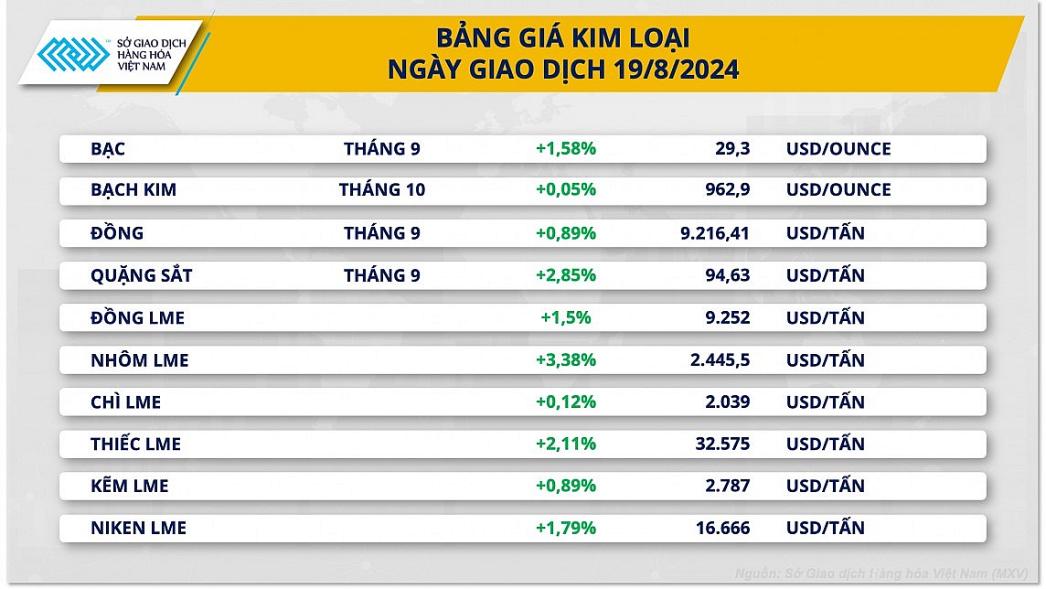 Thông tin từ Sở giao dịch hàng hóa Việt Nam (MXV), đối với kim loại quý, nhờ lo ngại rủi ro suy thoái tiếp tục được xoa dịu cùng sự suy yếu của đồng USD, giá bạc và giá bạch kim giữ vững sắc xanh và duy trì đà tăng từ các phiên cuối tuần trước. Chốt ngày, giá bạc tăng 1,58% lên 29,3 USD/ounce, giá bạch kim nhích lên 962,9 USD/ounce.