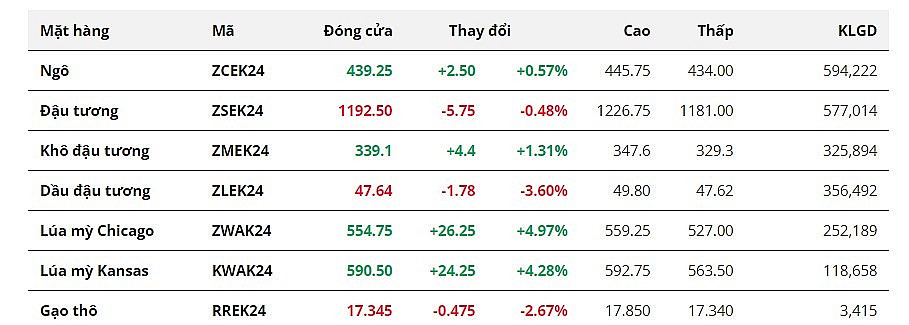 Đối với ngô, phe mua đã có phần chiếm ưu thế do mối lo ngại của thị trường về tình hình nguồn cung tại Ukraine. Cụ thể, Bộ Nông nghiệp nước này cho biết, diện tích trồng ngô năm 2024 của Ukraine sẽ giảm 4,5%, xuống còn 3,863 triệu héc-ta do giá giảm mạnh so với năm ngoái. Con số này cũng phù hợp với dự tính của Liên minh thương nhân ngũ cốc khi cơ quan này cho biết sản lượng ngô năm 2024 có thể giảm xuống 26,3 triệu tấn, so với mức 29,6 triệu tấn của năm ngoái.