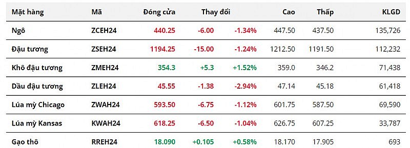 Khép lại phiên đầu tuần, sắc đỏ chiếm thế áp đảo trên bảng giá nông sản với ⅘ mặt hàng đồng loạt đóng cửa với mức sụt giảm mạnh hơn 1%. Đậu tương lao dốc ở phiên thứ 3 liên tiếp, đẩy giá xuống mức thấp nhất trong vòng 2 năm qua. Trong khi đó, giá ngô cũng nối dài đà suy yếu từ phiên cuối tuần trước trong bối cảnh tình hình vụ mùa ở Nam Mỹ đang được dần được cải thiện.