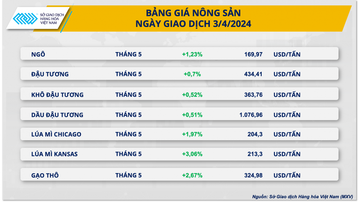 Ngoài ra, theo báo cáo từ Cơ quan Thông tin Năng lượng Mỹ (EIA), sản lượng ethanol đã ghi nhận tuần tăng thứ ba liên tiếp, đạt mức trung bình là 1,073 triệu thùng/ngày. Khối lượng ngô trong tuần được sử dụng làm nguyên liệu trong ngành công nghiệp này đạt mức cao nhất kể từ cuối tháng 2 đã phản ánh nhu cầu gia tăng tại Mỹ.