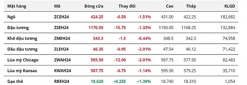Kết phiên 14/2, các mặt hàng nông sản đồng loạt đóng cửa trong sắc đỏ, khi mà đồng USD tăng giá mạnh tiếp tục là yếu tố đè nặng lên giá CBOT. Lúa mì và dầu đậu tương là hai mặt hàng dẫn đầu đà giảm của cả nhóm, khi đều lao dốc 2,01% vào hôm qua. Trong khi đó, tình hình mùa vụ tích cực hơn ở khu vực Nam Mỹ đã thúc đẩy lực bán mạnh mẽ đối với ngô và đậu tương.