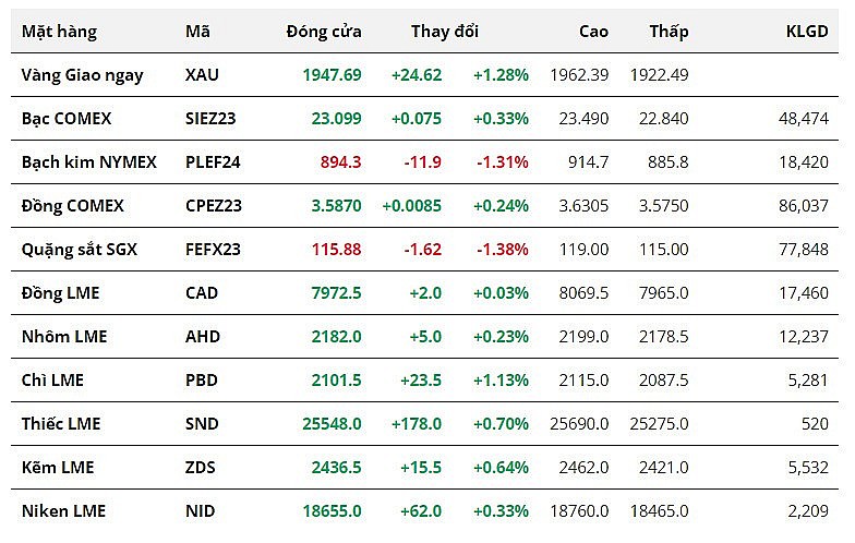 Đối với nhóm kim loại quý, giá bạch kim giảm 1,31% xuống 894,3 USD/ounce, chấm dứt chuỗi tăng hai phiên liên tiếp. Trái lại, giá vàng và bạc duy trì đà tăng sang phiên thứ hai. Cụ thể, giá vàng tăng 1,28% lên mức 1.947,69 USD/ounce và giá bạc đóng cửa tại mức 23,09 USD/ounce sau khi tăng 0,33%.