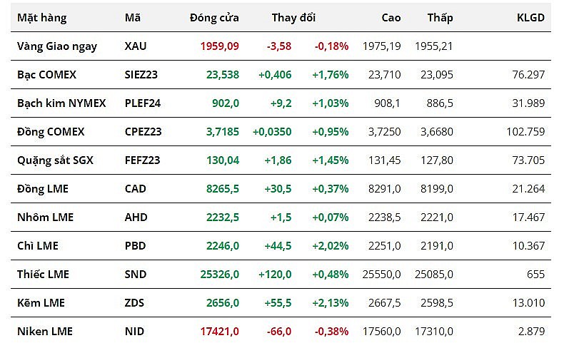 Đối với nhóm kim loại cơ bản, giá đồng COMEX cũng được hưởng lợi nhờ áp lực lãi suất giảm bớt. Chốt phiên, giá tăng 0,95% lên 3,71 USD/pound, đánh dấu phiên tăng thứ ba liên tiếp. Bên cạnh đó, dữ liệu kinh tế của Trung Quốc tích cực hơn dự báo cũng làm tăng sức mua đồng.
