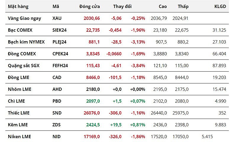 Đối với kim loại cơ bản, giá đồng COMEX nối tiếp đà giảm từ phiên cuối tuần trước, chốt phiên tại mức 3,83 USD/pound sau khi giảm 1,69%. Giá quặng sắt cũng để mất 3,84% về 115,43 USD/tấn, mức thấp nhất kể từ cuối tháng 10/2023. Cả giá đồng và giá quặng sắt đều gặp áp lực trước triển vọng tiêu thụ kém sắc tại Trung Quốc, quốc gia tiêu thụ kim loại hàng đầu.