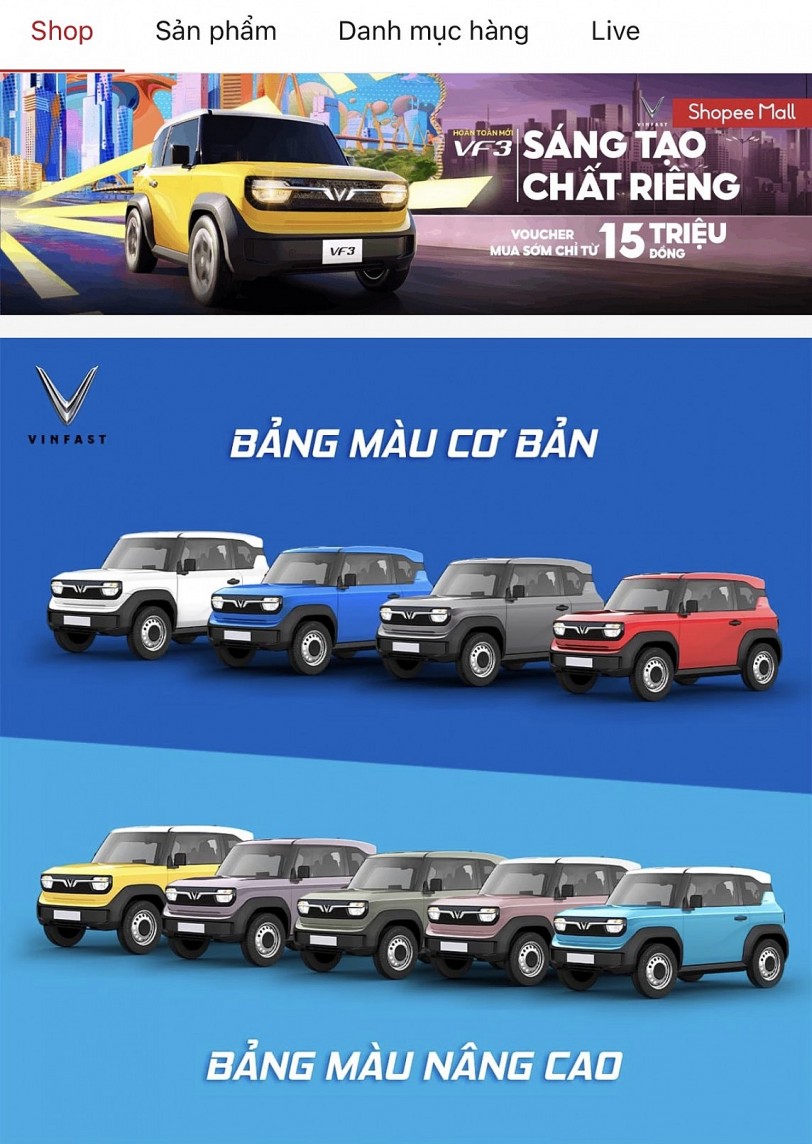 Đặc biệt, khách hàng đặt mua trên Shopee có thể sử dụng các mã giảm giá để tiết kiệm thêm chi phí. Đến hết ngày 14/5, đã có 4 đơn đặt cọc được ghi nhận trên nền tảng này. Xe điện mini VinFast VF 3 được đánh giá là có thiết kế phù hợp thị hiếu của số đông với 9 màu sắc khác nhau phù hợp cho mọi lứa tuổi. Hãng cũng cho phép người dùng chọn trước tất cả các màu, trong đó lựa chọn cá nhân hóa sẽ tăng thêm 15 triệu đồng nữa.