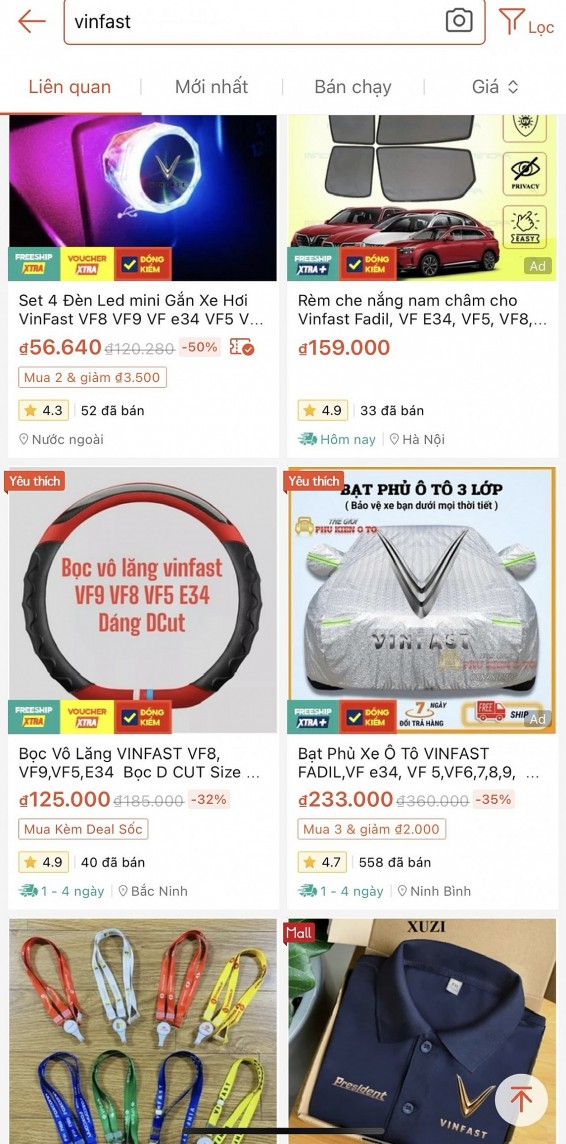 Theo đó, gian hàng VinFast trên Shopee Mall hiện có 31 sản phẩm và thu hút 9.200 người theo dõi, đánh giá trung bình 4.6 sao. Sản phẩm là các phụ kiện cá nhân như áo thun, thắt lưng da, gối cổ cho đến phụ kiện dành cho xe hơi, mô hình trang trí, sạc nhanh xe ô tô và không thể thiếu những mẫu xe máy điện.