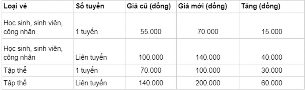 Vé mua theo hình thức tập thể (không ưu tiên) đi một tuyến 100.000 đồng (hiện là 70.000 đồng), liên tuyến 200.000 đồng (hiện là 140.000 đồng).