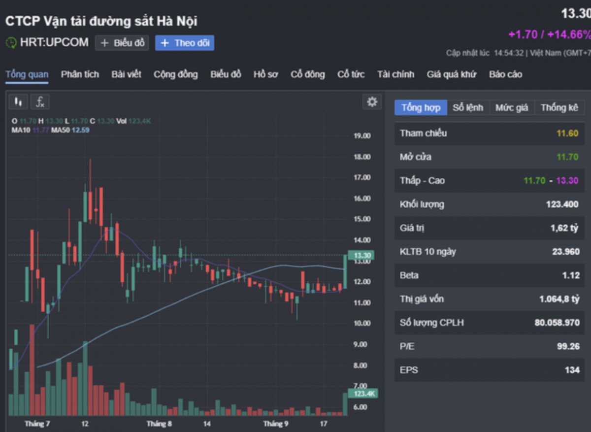Do vậy, ngay từ đầu phiên giao dịch 23/9, cổ phiếu HRT của Công ty CP Vận tải Đường sắt Hà Nội và SRT của Công ty CP Đường sắt Sài Gòn đều nhanh chóng tăng kịch trần và duy trì trạng thái "trắng bên bán" cho đến hết phiên.
