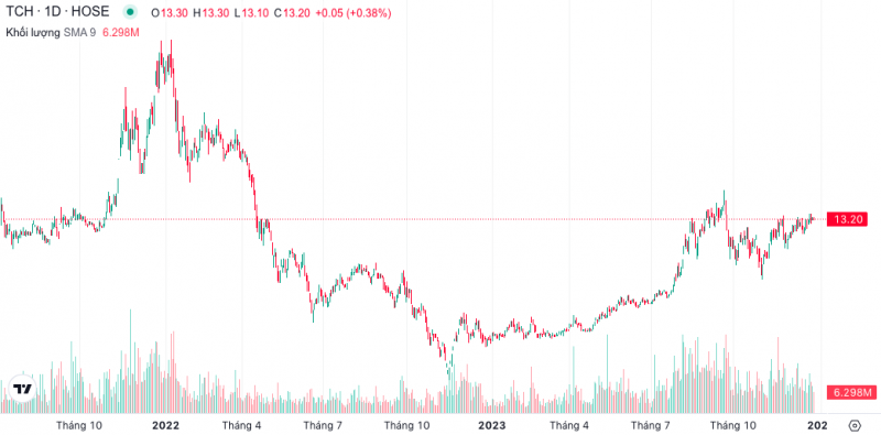 Trên thị trường chứng khoán, cổ phiếu TCH bắt đầu xu hướng tăng mạnh từ giữa tháng 7/2023, chỉ mất khoảng 1 tháng để mã này tăng khoảng 45% giá trị (từ 9.000 đồng/cp lên 13.000 đồng/cp). Sau khi lầm lũi lên vùng giá cao 14.500 đồng/cp, TCH xuất hiện những phiên điều chỉnh, hiện đứng ở mức 13.200 đồng/cp song vẫn tích cực nhất trong vòng 19 tháng trở lại đây (từ tháng 5/2022).