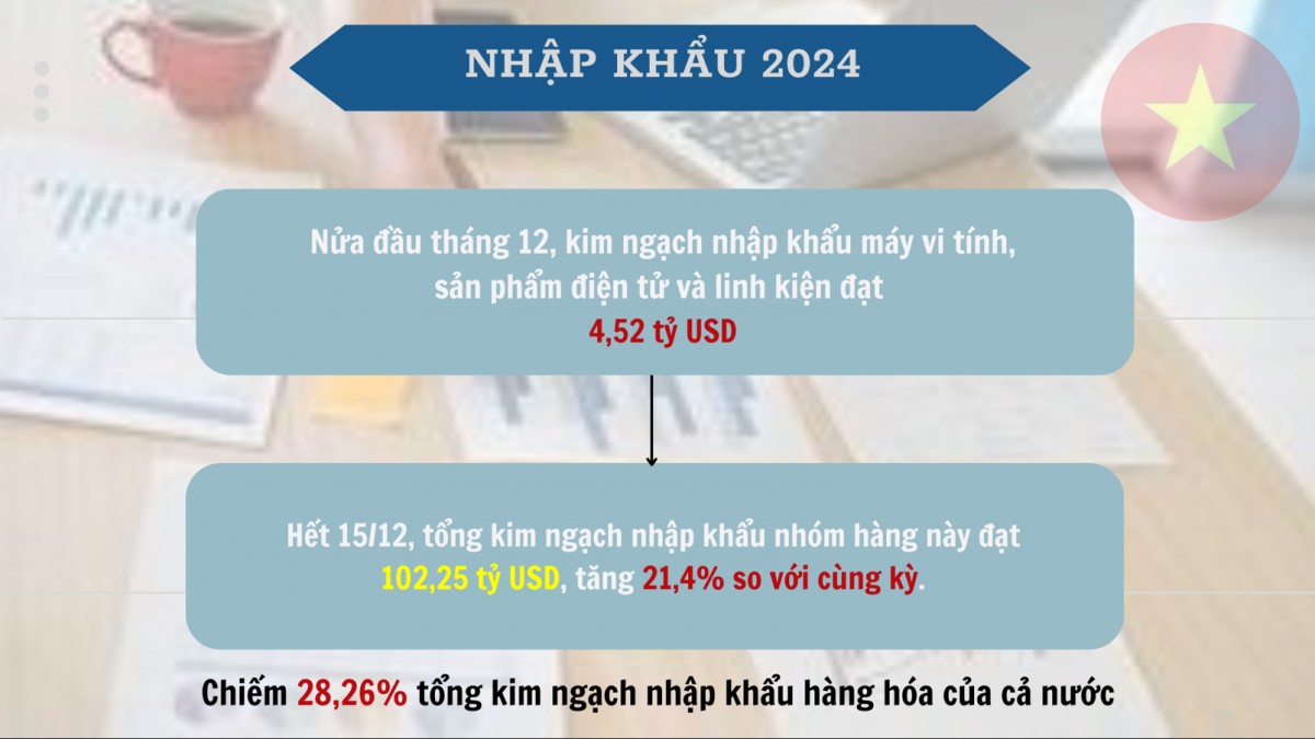 Tính đến hết 15/12/2024, nhóm máy vi tính, sản phẩm điện tử và linh kiện chiếm đến 28,26% tổng kim ngạch nhập khẩu hàng hóa của cả nước.