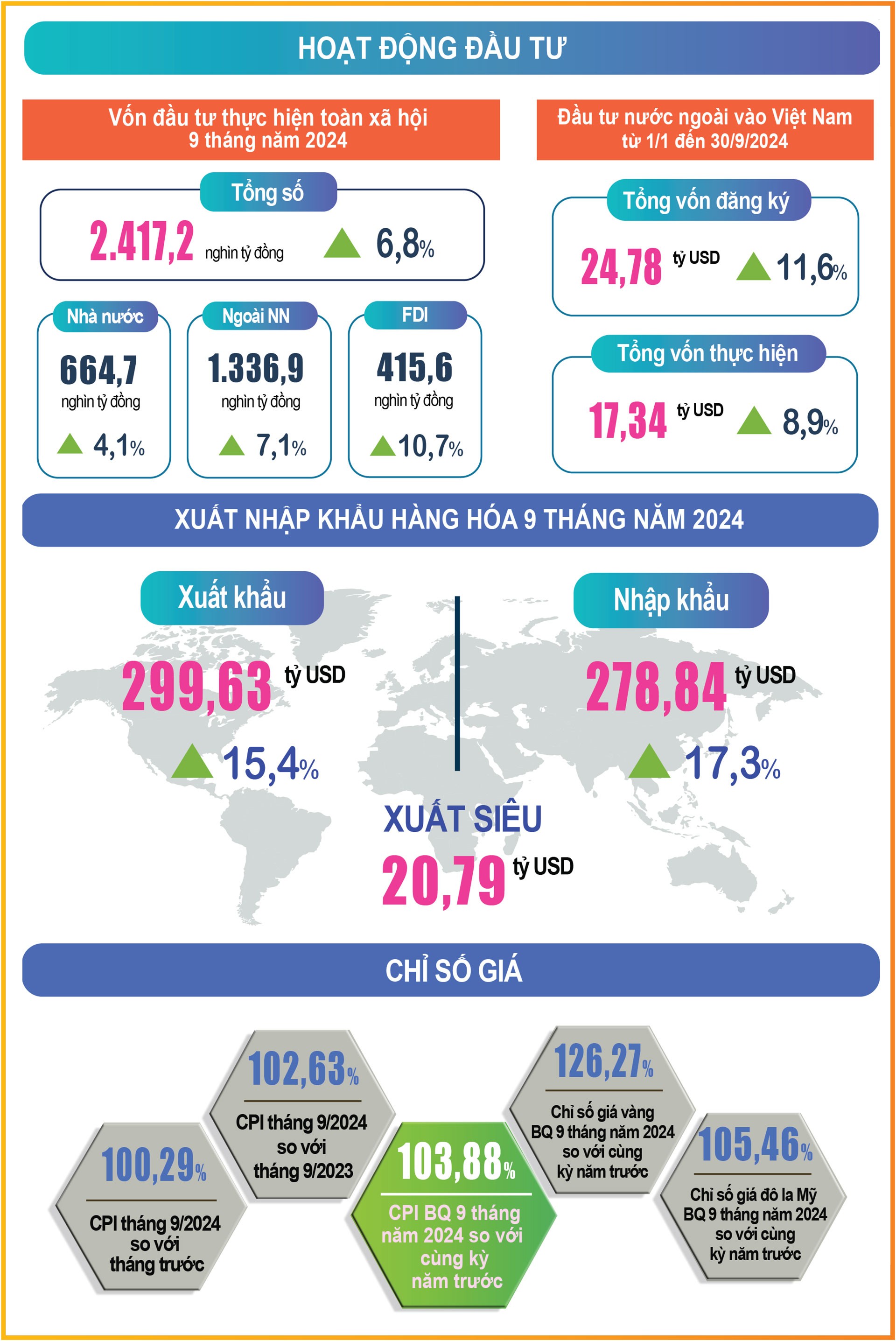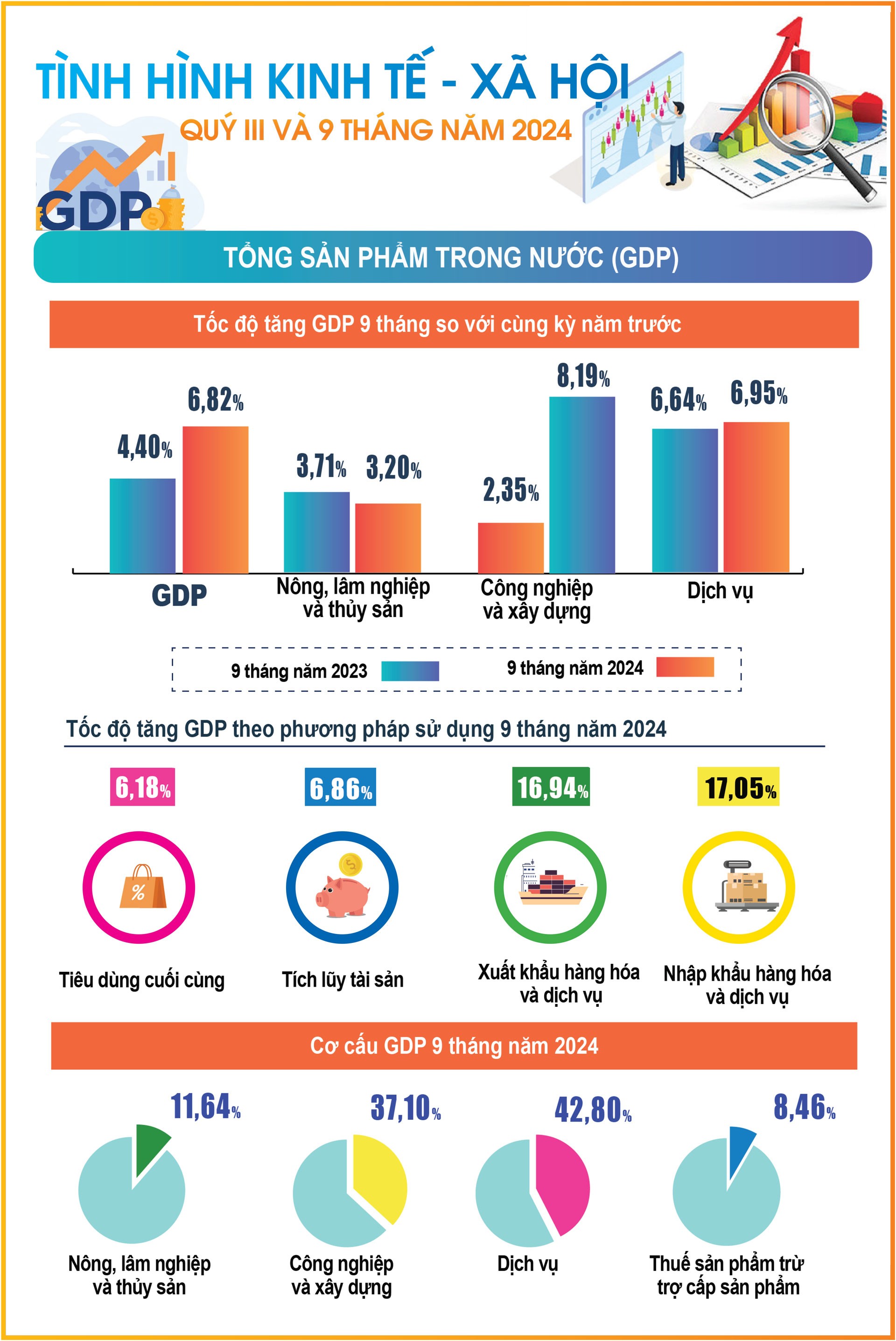 Bên cạnh đó, các Bộ, ngành, địa phương đã theo dõi chặt chẽ những biến động của tình hình kinh tế thế giới và trong nước, đồng thời nỗ lực thực hiện nhiệm vụ, giải pháp đặt ra, từ đó tạo được sự tin tưởng, ủng hộ của nhân dân và cộng đồng doanh nghiệp. Nhờ đó, kinh tế - xã hội quý III và 9 tháng năm 2024 của nước ta tiếp tục xu hướng tích cực, các ngành, lĩnh vực đạt được nhiều kết quả quan trọng, tạo đà tăng trưởng cho những tháng còn lại của năm.