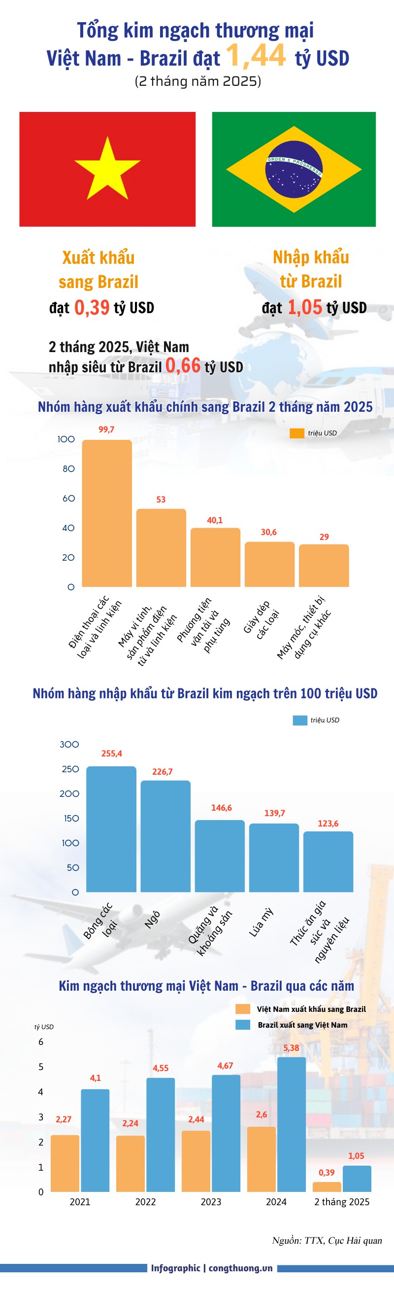 Theo Cục Hải quan, 2 tháng đầu năm 2025, kim ngạch xuất nhập khẩu hai chiều giữa Việt Nam và Brazil đạt 1,44 tỷ USD; trong đó, xuất khẩu hàng hóa Việt Nam sang Brazil đạt 0,39 tỷ USD. Chiều ngược lại, hàng hóa nhập khẩu từ Brazil về Việt Nam đạt 1,05 tỷ USD.