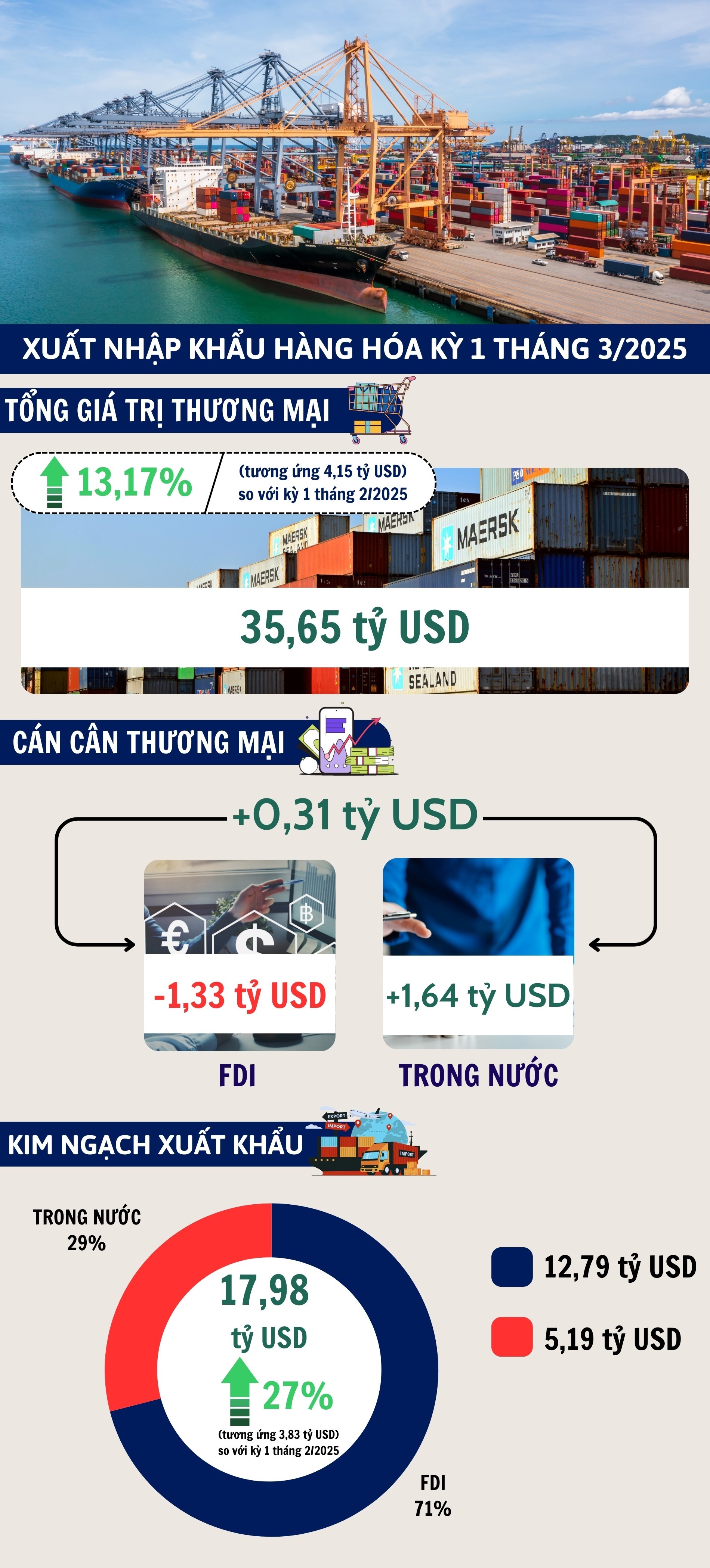 Theo số liệu thống kê của Cục Hải quan, tổng trị giá xuất nhập khẩu hàng hóa của Việt Nam trong kỳ 1 tháng 3/2025 đạt 35,65 tỷ USD.