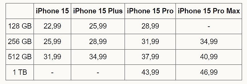 Theo đó, iPhone 15 có giá từ 23 triệu đến 32 triệu đồng, 15 Plus từ 26 triệu đến 35 triệu đồng tùy dung lượng bộ nhớ. Trong khi đó, 15 Pro được bán từ 29 triệu đến 44 triệu đồng, 15 Pro Max khởi điểm 35 triệu cho bản 256 GB và cao nhất 47 triệu đồng cho bộ nhớ một TB.