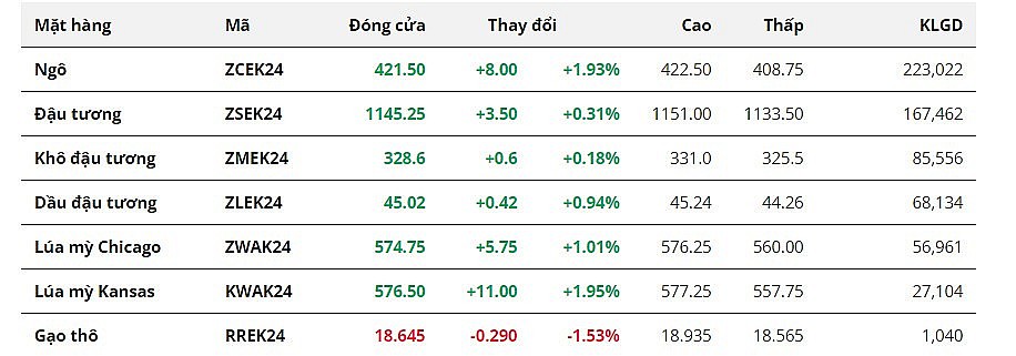 Sắc xanh hoàn toàn chiếm thế áp đảo trên thị trường nông sản sau khi đóng cửa phiên giao dịch đầu tuần. Nhóm họ đậu diễn biến tương đối rung lắc kể từ ghi mở cửa, và kết phiên với mức biến động nhẹ, chưa tới 1%. Trong khi đó, giá ngô hồi phục mạnh từ mốc thấp nhất trong hơn 3 năm qua, và trở thành mặt hàng tăng mạnh nhất cả nhóm với mức hồi phục gần 2%.