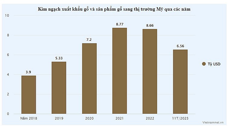 Những năm gần đây, mặt hàng gỗ và sản phẩm gỗ được thị trường Mỹ ưa chuộng, giá trị xuất khẩu từ con số gần 3,9 tỷ USD năm 2018 đã tăng lên mốc 8,66 tỷ USD năm 2022. Xuất khẩu sang Mỹ đều chiếm tỷ trọng lớn trong tổng kim ngạch xuất khẩu ngành hàng này.