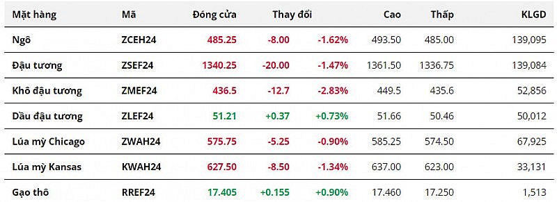 Trong khi đó, giá khô đậu dẫn đầu đà giảm của nhóm khi lao dốc gần 3% khi thị trường đón nhận những tín hiệu tích cực về triển vọng mùa vụ đậu tương của Argentina. BAGE cho biết tiến độ trồng đậu tương của nước này đã đạt 18% kế hoạch, nhanh hơn đáng kể so với mức cùng kỳ năm ngoái nhờ điều kiện thời tiết thuận lợi. Đây cũng là nguyên nhân lý giải cho việc BAGE nâng dự báo diện tích canh tác năm nay của Argentina lên 17,3 triệu héc - ta đậu tương. Với nguồn cung dự kiến nới lỏng hơn tại một trong những quốc gia xuất khẩu đậu tương và khô đậu lớn trên toàn cầu, lực bán liên tục chiếm ưu thế trên bảng giá của các mặt hàng này.