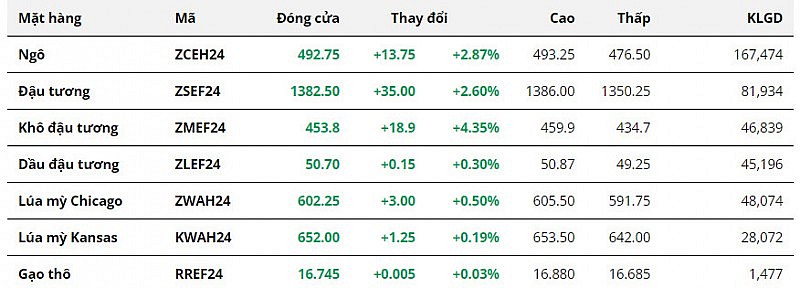 Kết thúc phiên giao dịch đầu tuần, sắc xanh phủ kín bảng giá của các mặt hàng nhóm nông sản. Khô đậu tương là mặt hàng có diễn biến đáng chú ý nhất với mức tăng vọt tới 4,35%, đẩy giá lên mức cao nhất trong gần 8 tháng trở lại đây.