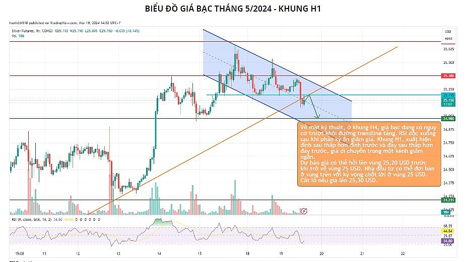Về mặt kỹ thuật, ở khung H4, giá bạc đang có nguy cơ trượt khỏi đường trendline tăng. RSI dốc xuống sau khi phân kỳ ẩn giảm giá. Khung H1, xuất hiện đỉnh sau thấp hơn đỉnh trước và đáy sau thấp hơn đáy trước, giá di chuyển trong một kênh giảm ngắn. Dự báo giá có thể hồi lên vùng 25,20 USD trước khi trở về vùng 25 USD. Nhà đầu tư có thể đợi bán ở vùng trên với kỳ vọng chốt lời ở vùng 25 USD. Cắt lỗ nếu giá lên 25,30 USD.