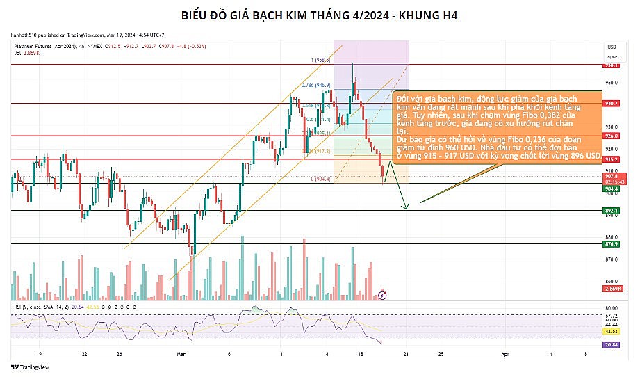 Đối với giá bạch kim, động lực giảm của giá bạch kim vẫn đang rất mạnh sau khi phá khỏi kênh tăng giá. Tuy nhiên, sau khi chạm vùng Fibo 0,382 của kênh tăng trước, giá đang có xu hướng rút chân lại. Dự báo giá có thể hồi về vùng Fibo 0,236 của đoạn giảm từ đỉnh 960 USD. Nhà đầu tư có thể đợi bán ở vùng 915 – 917 USD với kỳ vọng chốt lời vùng 896 USD.