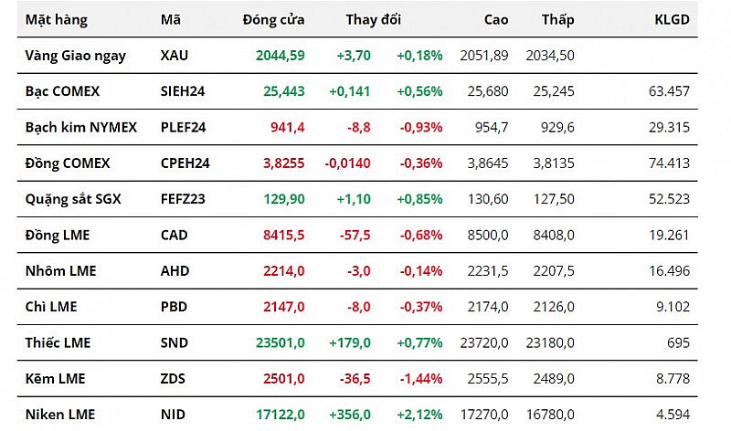 Đối với kim loại quý, giá bạc nối dài đà tăng sang phiên thứ ba liên tiếp, chốt phiên tại 25,44 USD/ounce nhờ tăng 0,56%. Trái lại, giá bạch kim giảm 0,93% so với mức tham chiếu, đóng cửa tại 941,4 USD/ounce.