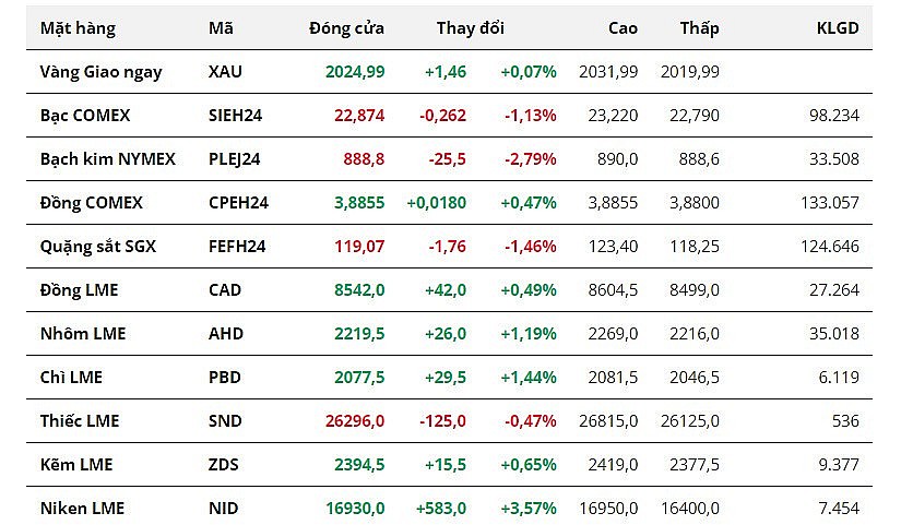 Đối với nhóm kim loại cơ bản, biến động có phần trái chiều, nhưng phần lớn đều ghi nhận đà tăng giá, trái ngược xu hướng của nhóm kim loại quý. Ngoại trừ đà giảm 1,46% của quặng sắt và 0,47% của thiếc LME, các kim loại cơ bản khác đều kết phiên trong sắc xanh. Đáng chú ý nhất, giá nickel LME tăng mạnh 3,57% lên 16.930 USD/tấn. Giá nhôm LME tăng trên 1% lên 2.219,5 USD/tấn. Đà tăng chủ yếu xuất phát từ suy đoán rằng một làn sóng trừng phạt mới của Mỹ đối với Nga có thể nhắm vào kim loại và làm gián đoạn nguồn cung.