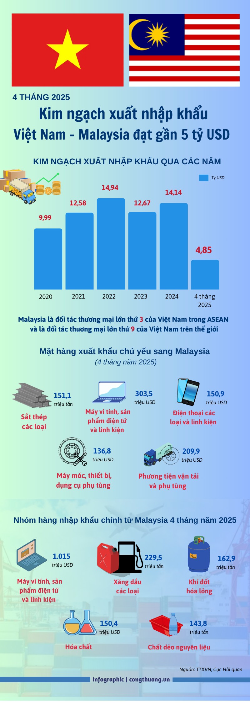 Thống kê từ Hải quan Việt Nam cho biết, 4 tháng đầu năm 2025, tổng kim ngạch xuất nhập khẩu giữa Việt Nam và Malaysia đạt 4,85 tỷ USD, giảm 1,2%; trong đó, xuất khẩu đạt 1,72 tỷ USD, tăng 3,7% và nhập khẩu đạt 3,13 tỷ USD, giảm 3,7% so với cùng kỳ năm 2024.