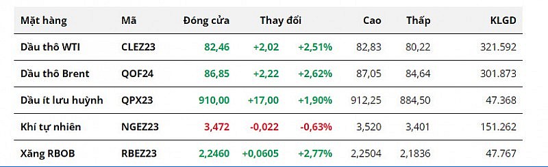 Cụ thể, giá dầu WTI tăng 2,51% lên 82,46 USD/thùng và dầu Brent chốt phiên tăng 2,62% lên mức 86,85 USD/thùng.